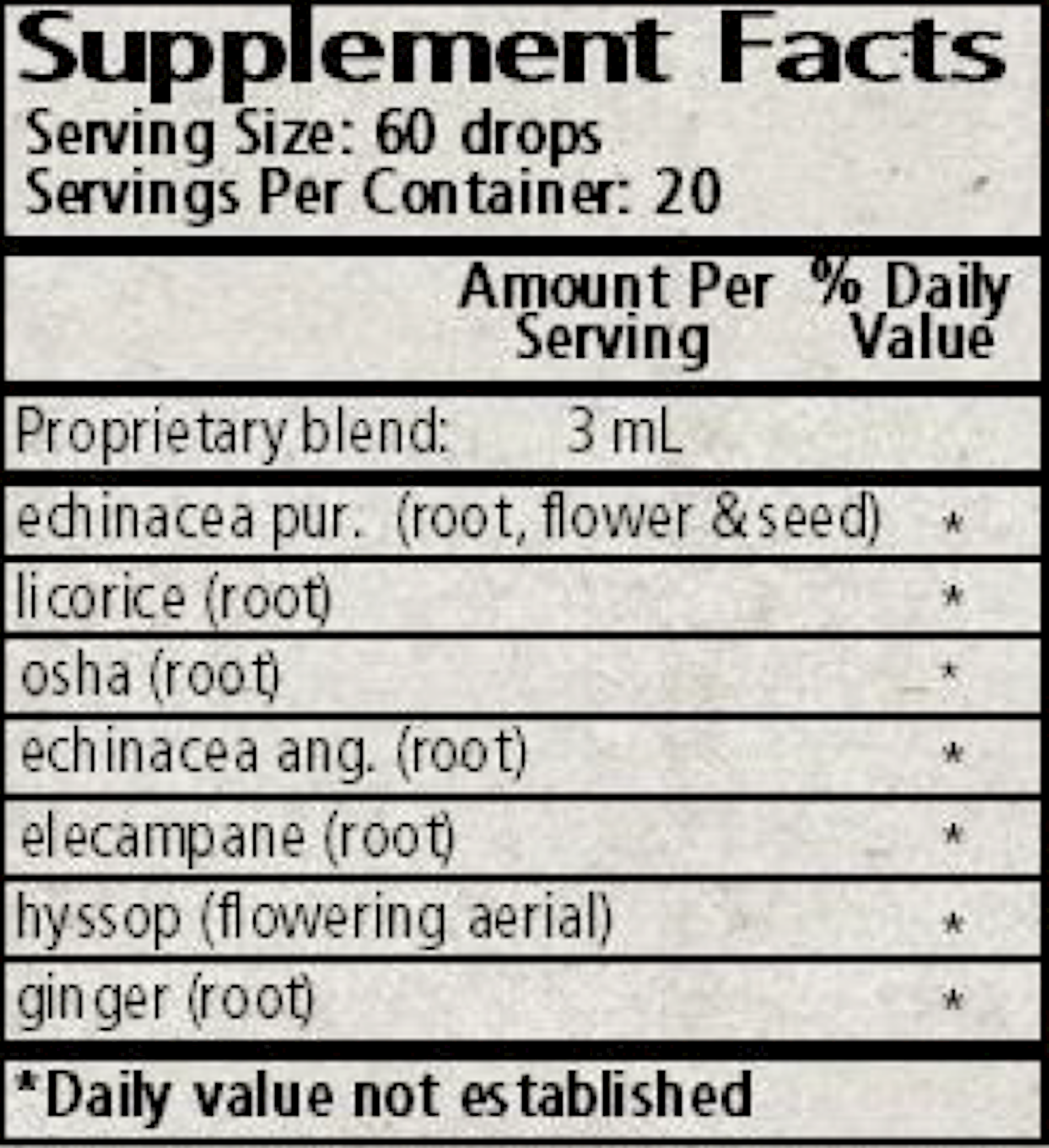 IngredientsAmount Per Serving Proprietary Blend 0.8ml Ingredients: echinacia pur. (root, flower & seed), licorice (root), osha (root), echinacea ang. (root), elecampane (root), hyssop (flowering herb) and ginger (root). other ingredients: organic alcohol and spring water. Organic alcohol 48-53%